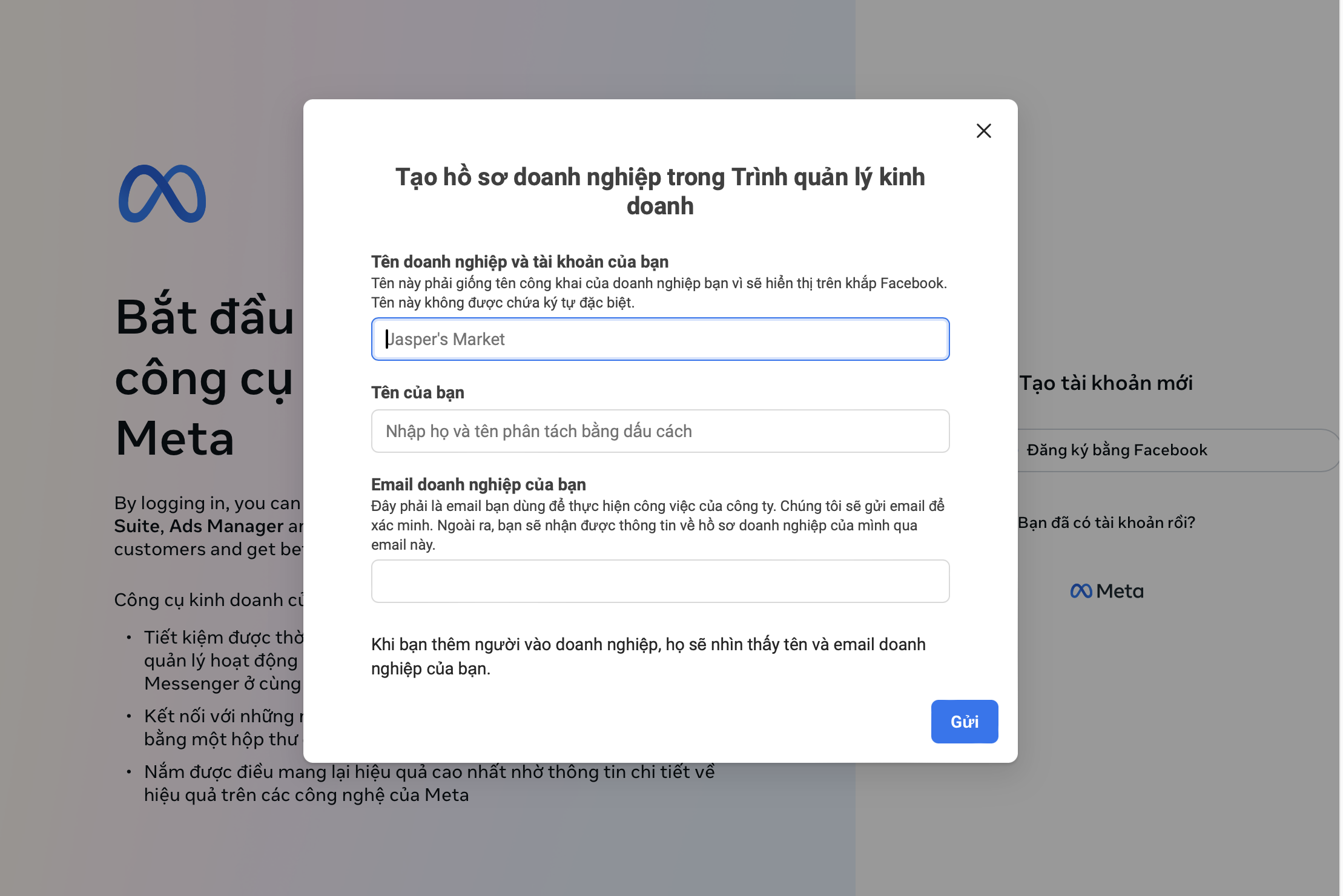 - Nhập email kinh doanh (nên dùng email thật để nhận xác minh).