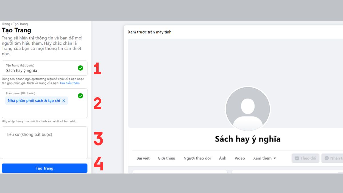 • Nếu tài khoản mới tạo, Facebook có thể yêu cầu xác minh số điện thoại/email trước khi tạo Trang.
