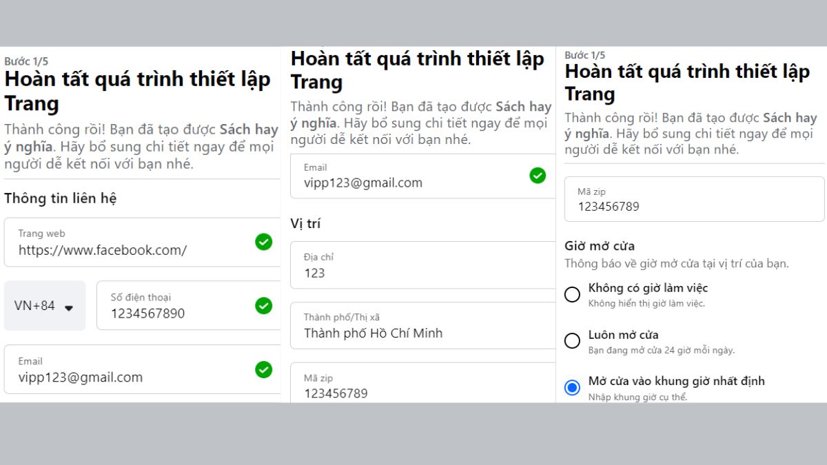 • Thiết lập Giờ mở cửa, Địa chỉ, Email → hiển thị trên Trang.